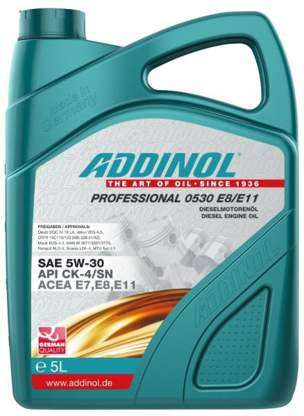 ADDINOL Professional 0530 E8 E11 ist ein Dieselmotorenöl der SAE-Klasse 5W-30 und erfüllt die extremen Motorenöl-Anforderungen der strengen Euro V- und Euro VI-Abgasnorm.
